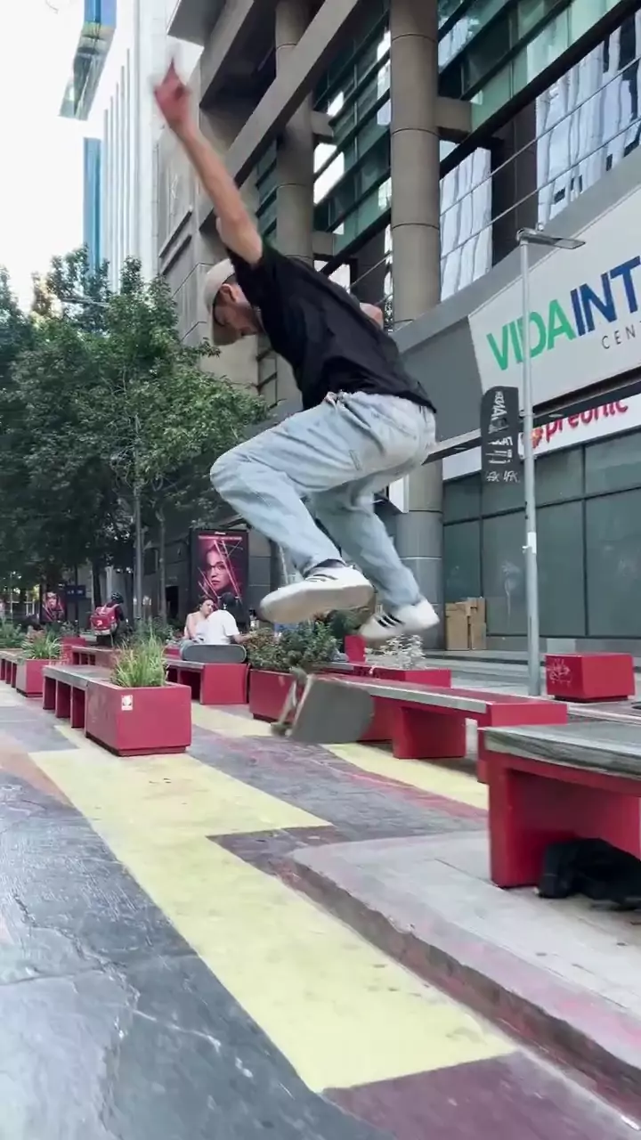 Trick: Bs noseslide to nollie flip out street ledge gap, Paseo Bandera.Skater: Darío Reyes Millán [Chile]